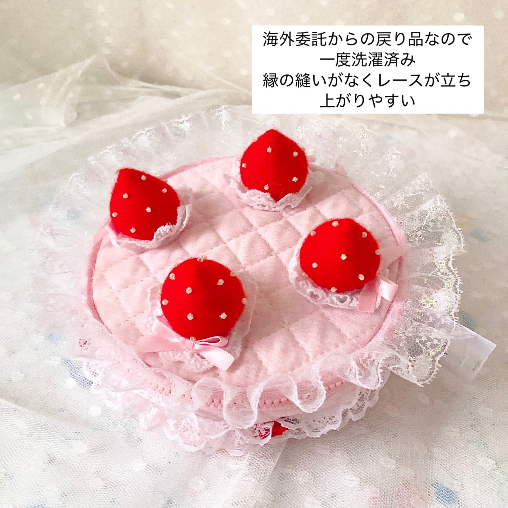 ・以前の作り方のためバイアステープ無し・中身が入ってないと重みで下がへたりやすい、縁の縫い目もないのでレースが立ち上がりやすい